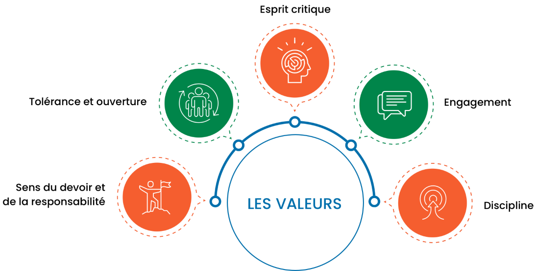 Tolérance et ouverture, Sens du devoir et de la responsabilité, Esprit critique, Engagement, Discipline